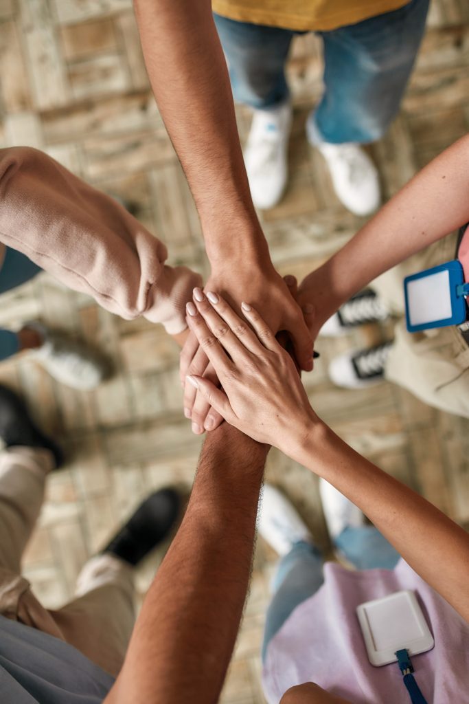 Top view of diverse young volunteers putting their hands on top of each other like a real team while standing in a charitable organization office, Selective focus on hands, Vertical shot